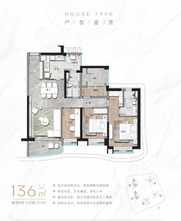 此外,为了把引景入室进行到底,约161平户型还配备双开间大阳台+南北双阳台设计,辽阔江面+南北通透收于家中。