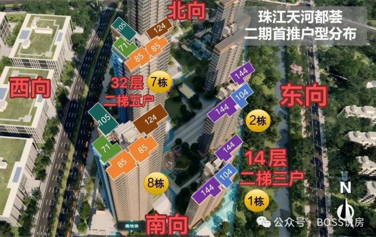 二期组团:共8栋,首开1/2栋小高层,14-15层【2梯3户】,7/8栋高层,32层【2梯5户】