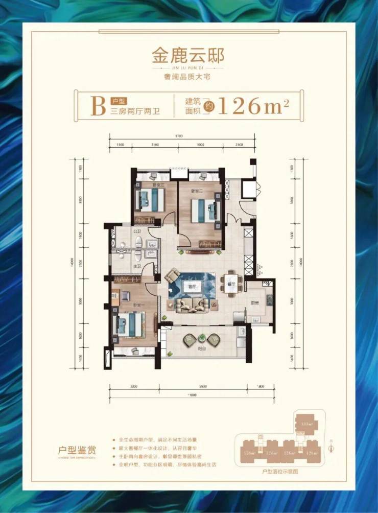 建筑面积约126㎡-133㎡奢阔品质大宅;全生命周期户型,满足不同生活场景;超大客餐厅一体化设计,从容且奢华;主卧套房精致设计,彰显尊贵兼顾私密;全明户型、功能分区明确、尽情体验高尚生活;