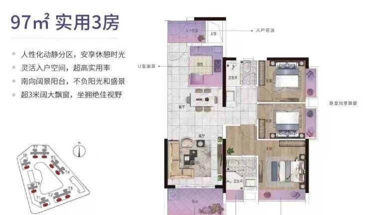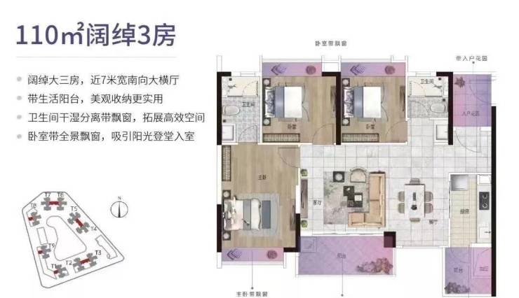 建面约110㎡的阔绰3房,纯南北对流户型,且设计约7米宽的南向大横厅,似将要把整个阳光揽入屋中。增加了一个生活阳台,美观收纳更实用。