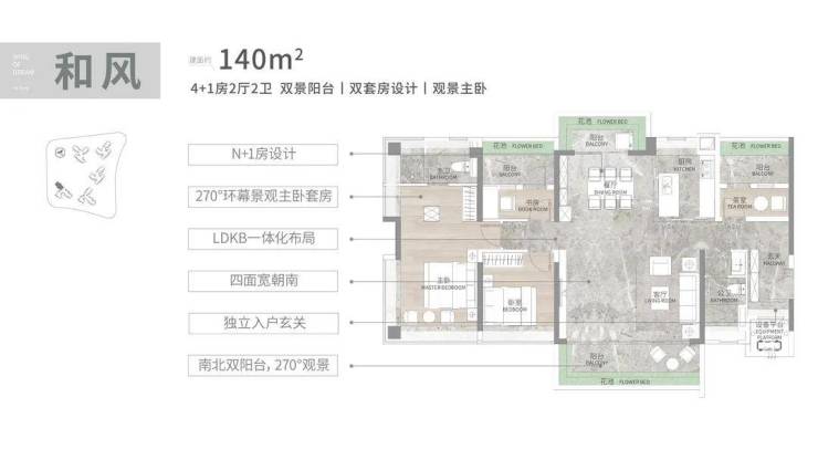 建面140平4+1房,同样四开间朝南,南向采光面达到了15.7米,南北双阳台,LDKB一体化设计,主套配置270度折叠屏飘窗