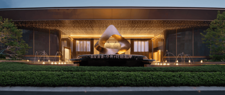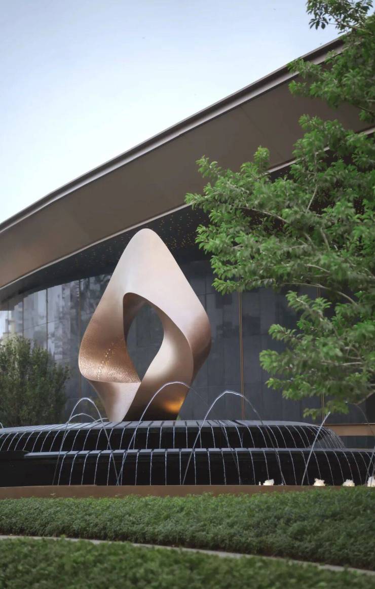雕塑水景《洄》以“岸际时光的时空对话与转换”为核心,诠释着“时间在洄游中穿透”的哲思。雕塑扭转翻腾却又归于原点,表达了一种水岸来去的溯洄与追寻。冲孔细节结合灯光设计,晚间透过缝隙泛出金色光影。水生于此又回落于水面,代表了东方原生岸际情结的归宿与融合。