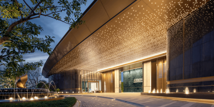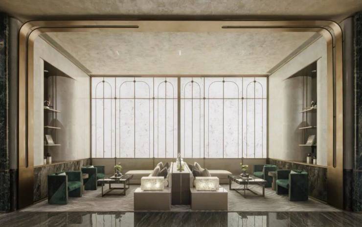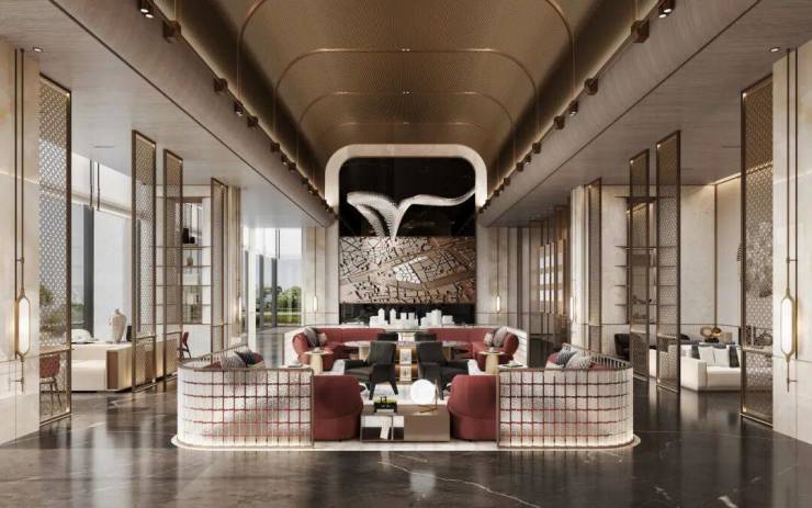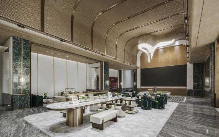 在方案设计阶段,设计团队采用现代轻奢风格,结合广州岭南在地元素,如镬耳屋、雕窗、石材拼花,同时结合骑楼建筑、建筑穹顶等元素,用现代的设计语言表达对广州中西合璧的历史记忆。