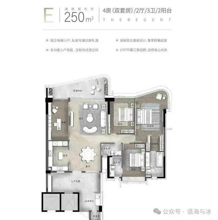 多元化产品线:涵盖140-480㎡江景大平层、叠墅(279-437㎡),其中叠墅实用率高达355%,配备私家电梯、入户花园及超大露台,部分户型首层花园达797㎡。