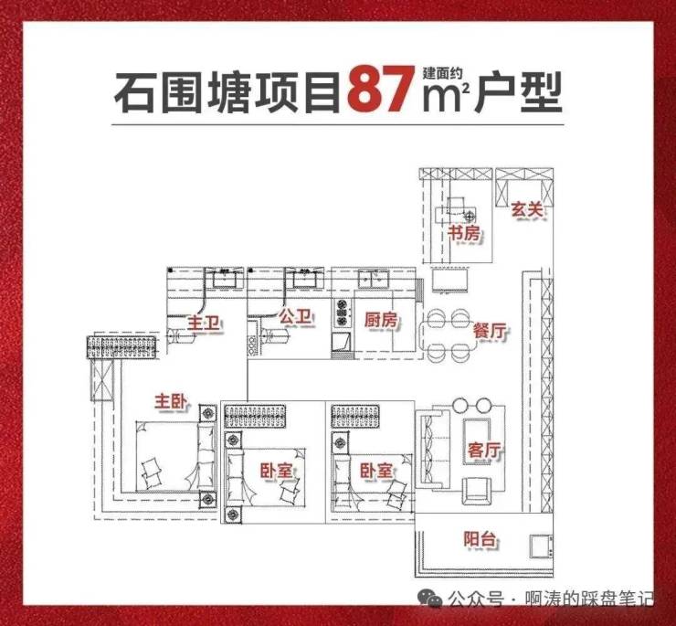 约87㎡则是4房2卫,但两个户型差距较大,其中一个是拥有独立玄关的竖厅。