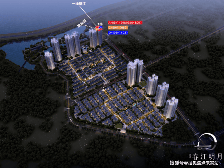 项目目前在售的1栋,建面约83/90/105㎡江景洋房,高实用率纯南向瞰景、北向瞰江,南北通透户型,千米楼距。