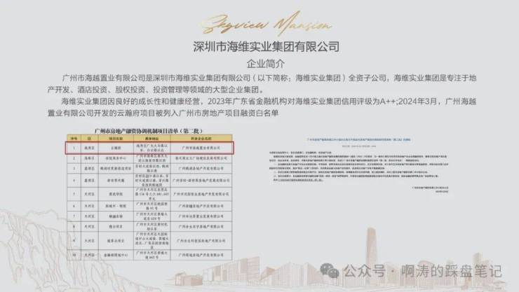 海维实业集团因良好的成长性和健康经营,2023年金融机构对海维实业集团信用评级为A++;2024年3月,广州海越置业有限公司开发的云瀚府项目被列入广州市房地产项目融资白名单。