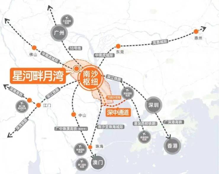 南沙区作为粤港澳大湾区核心枢纽,具备国家级新区、自贸区、广州副中心等多重战略定位,发展潜力巨大。星河·畔月湾所在的万顷沙板块,与横沥岛仅隔一江之距,共享广州地铁18号线的发展红利。未来,横沥岛规划成熟后,将直接带动周边房价上升。此外,项目紧邻南沙枢纽TOD站,未来将建成14站30线的超级轨道交通枢纽,站台规模仅次于广州南站,交通便利性进一步提升。