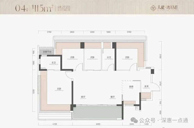 115㎡的4房2厅2卫,设计的是横厅南北通透格局,进门可做800库玄关,客餐厅6.3米开间,LDKB一体化,五开间朝南,分别做到了主卧21.52㎡/次卧13.69㎡/次卧11.88㎡/次卧8.14㎡(包含墙体飘窗),U型厨房,主卧卫生间带1个设备平台约1.71㎡,得房率约81%(不含赠送),客厅连接餐厅出6.3米长的大阳台约11.34㎡,西南朝向。套内面积93.15㎡+飘窗20.63㎡+阳台5.67㎡+设备平台1.71㎡=实得面积121.16㎡,加上赠送后得房率约105.36%。
