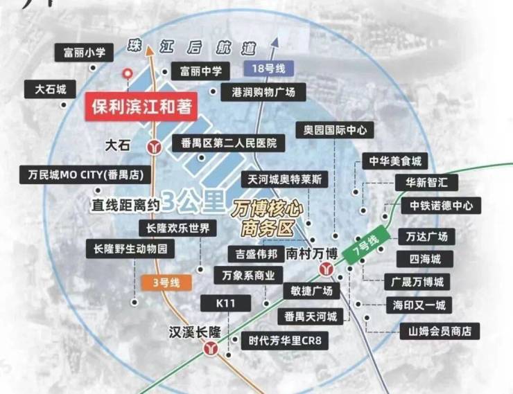 距离地铁3号线大石站约1.3公里,步行约19分钟,去客村珠江新城不用换乘可以直达,坐上地铁,2站到长隆,3站到万博,4站到客村,6站珠江新城,自驾的话会方便很多,出门就是新光快速,不堵车的话,去珠江新城半个钟即可。