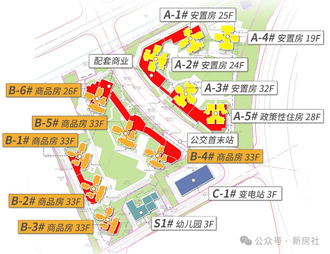 小区配套:整个项目,以中间规划路为界,左侧是6栋商品房,右侧是5栋安置房(含1栋公租房),配建有1所9班幼儿园、托儿所和公交首末站,1.8万㎡围合式大园林及1.5万㎡红线内外绿化。