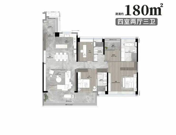 如果要展开细说,建面约180㎡的产品,当然不止面宽和双套房这两个优点,还有入户玄关啦、全明空间啦等等。