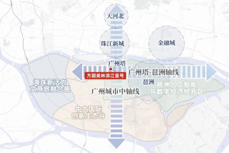 方圆美林·滨江壹号由方圆集团与美林基业联合开发,坐落于广州海珠区新港中路,与广州塔直线距离仅700米,紧邻珠江新城、琶洲CBD两大世界级商务中心,占据广州新中轴核心地段,是广州塔-琶洲数字经济示范区的连片开发项目。
