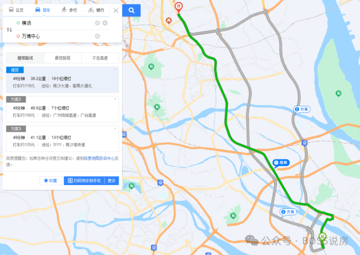 去万博中心,无论是走低速番禺大道,还是走南沙港快速或者广澳高速,时间均为49分钟