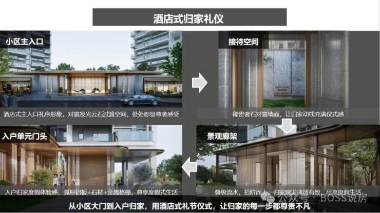 酒店式门头:植入港湾式落客形式,臻选温德姆灰石材,正入口整面发光云石,呈现艺术级精雕细琢及酒店精奢归家氛围