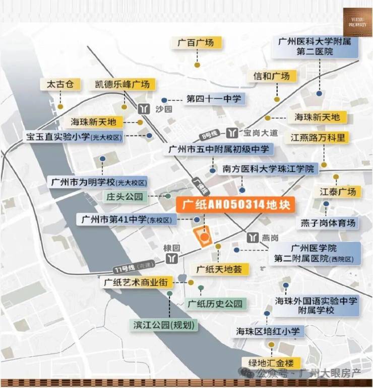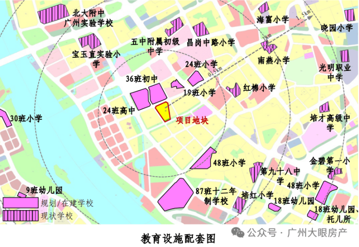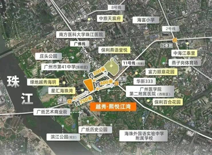 项目自身没有配建学校,但周边名校环伺,3km直线范围内包含广州市五中附属初级中学(省级)、广州市第41中学(省级)、宝玉直实验小学(光大校区)、江南外国语学校、工业大道中小学、红棉小学、海富小学、南燕小学、培红小学等9所学校环伺,拥有完善的区域教育体系。