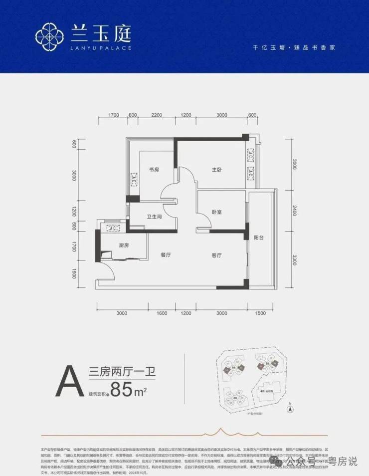 85㎡的3房2厅1卫,A户型,设计的是竖厅格局,客厅开间3.3米,LDKB一体化,三开间朝南,3个卧室分别做到了3米/2.8米/2.4米的宽度,客厅连接次卧出5.7米长的大阳台,L型厨房,得房率约79%(不含赠送),西南或东南朝向。