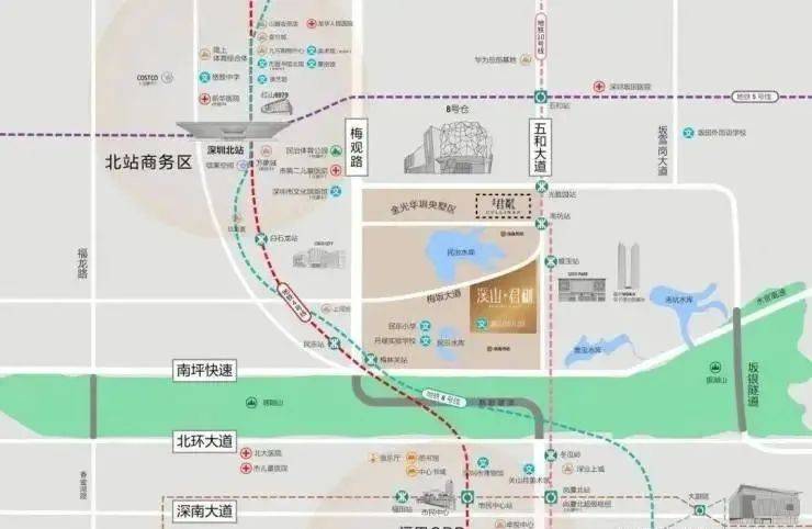 小区周边已有交通网络四通八达,梅坂大道、梅龙路、福龙路、新区大道、民治大道、梅观高速及南坪快速等主干道临近项目周边,从小区出行至福田区、南山区、龙华、布吉等区域十分便利。