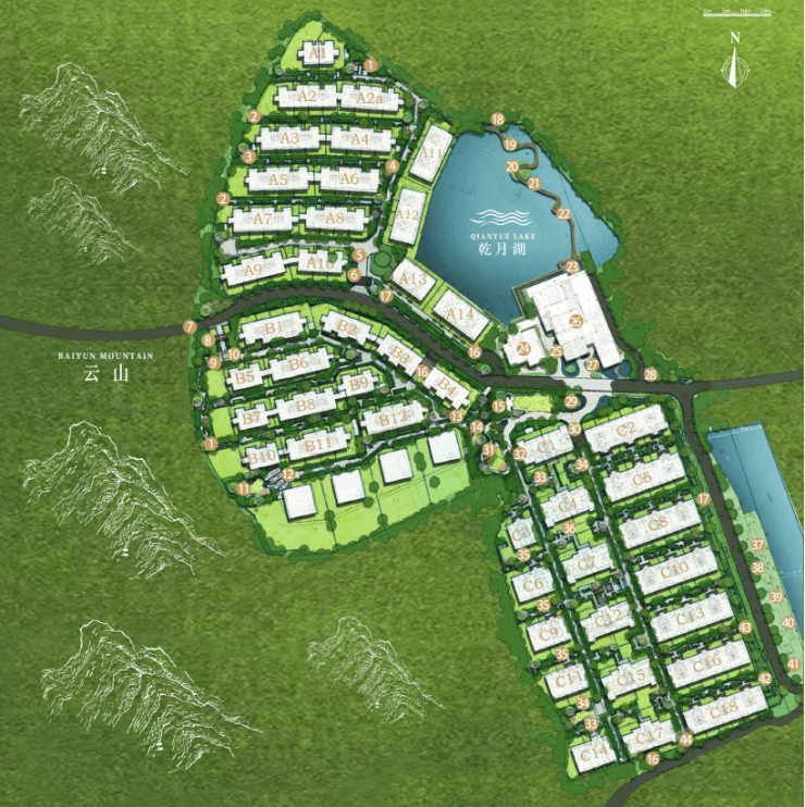 低密臻藏 山湖院落于云山东麓依山而建,秉承以人为本的设计理念,科学考量采光、通风、楼体间距等每一处细节, 最终达到户户南北对流,实现山湖景观资源的完美呈现,遵循原生自然地貌之上,沿山势地脉巧妙布局,依山而建,层层环绕,打造城央稀缺低密院落。