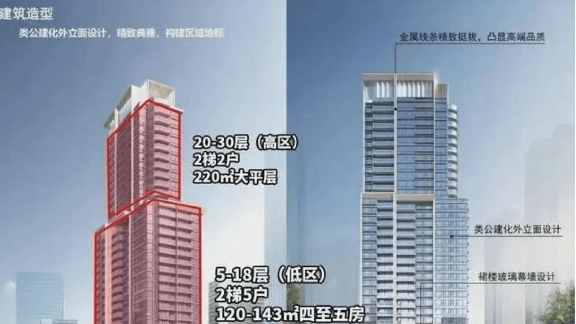 【层高】:5-18层,2梯5户,户型为120-143㎡四至五房;20-30层,2梯2户,户型为220㎡大平层。