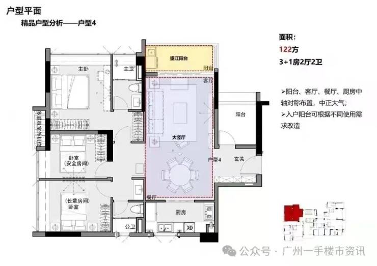 整个保利阅江台仅规划建设1栋30层高住宅楼,产品户型为121-210㎡平层三至四房。