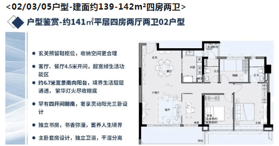 整个保利阅江台项目分为低区和高区,低区5-18层是两梯五户的设计,户型涵盖121-143㎡三至四房;高区20-30层则是两梯两户的设计,户型为208-210㎡的大平层四房产品,整个项目住宅总共仅92户稀缺单位,产品户型主要面向市中心改善型客户群体。
