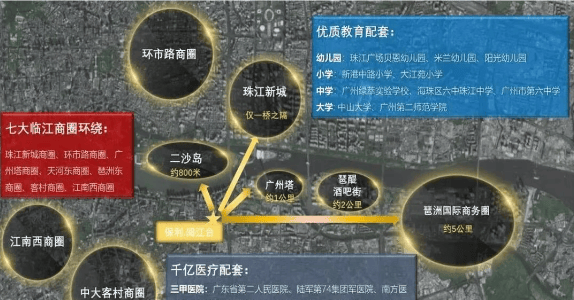 项目北靠珠江新城,东北望广州塔,一桥即达珠城CBD,仅5分钟即享受150万㎡的千亿级商圈,K11、天河城、天环广场、太古汇等大型购物中心齐聚。