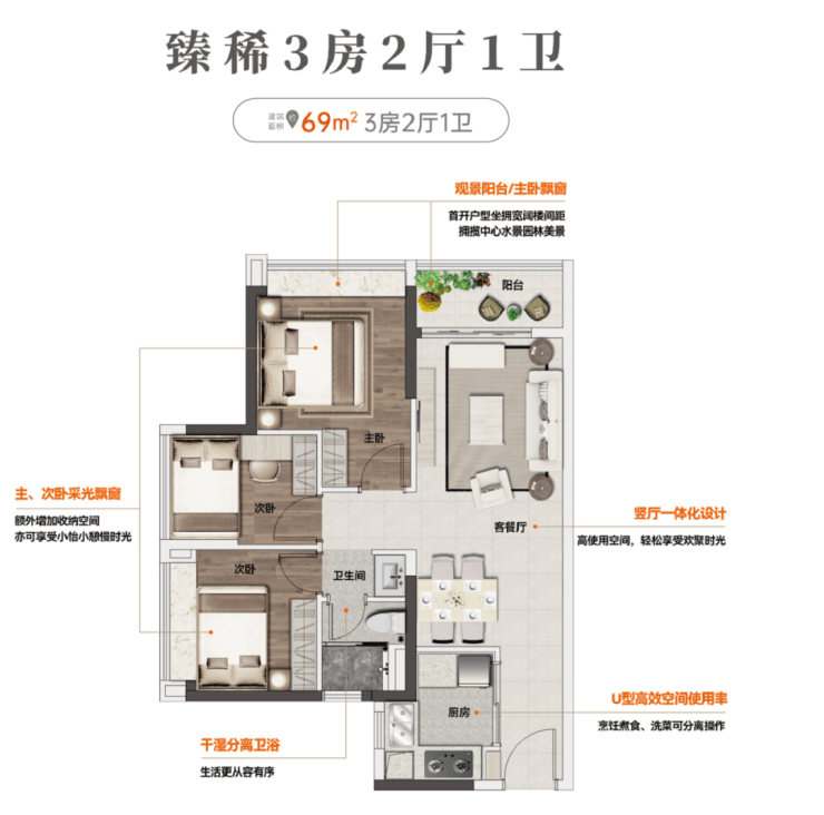 建面约69㎡丨低总价三房一卫