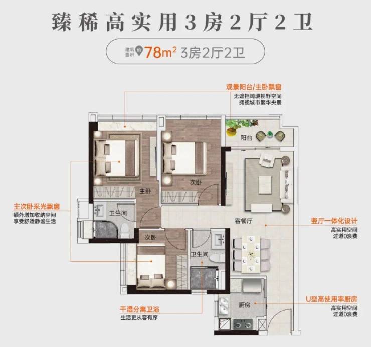建面约78㎡丨低总价三房两卫