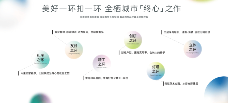 以6C 满贯价值打造和系标杆社区:立体之环构建三层垂直生活系统(城市广场 + 浮岛商街 + 空中花园),通勤、消费、居住无缝衔接;灯塔之环以微弧艺术立面、美学天际弧、入户穹幕弧,打造亚运城地标封面;友好之环规划童梦基地、静谧绿洲、活力聚场、共享私屿,覆盖全龄休闲需求;礼序之环打造六重归家动线,从环宇城广场到入户玄关,步步私密尊崇;精工之环搭载中海和系精工 + 系统,以安全、舒适、绿色、智慧四大维度,配置新风、中央空调、洗净中心、烹饪中心,匠筑品质人居。