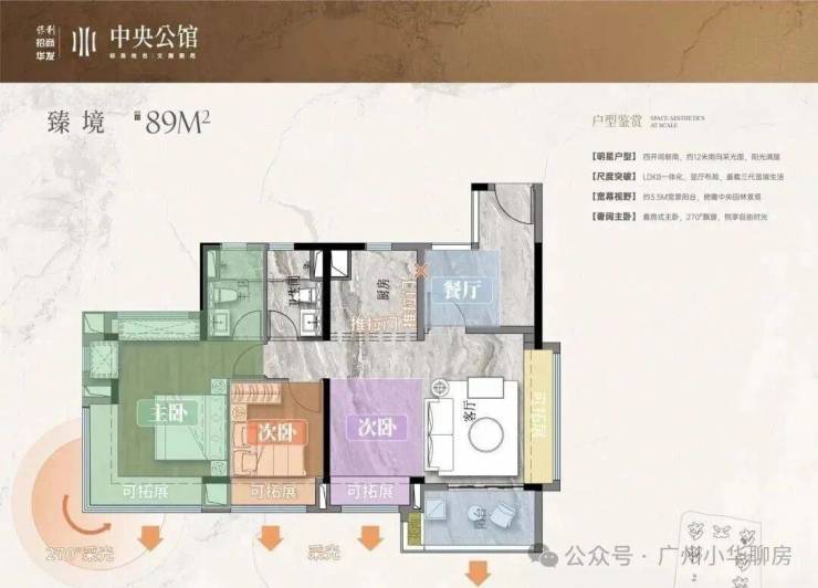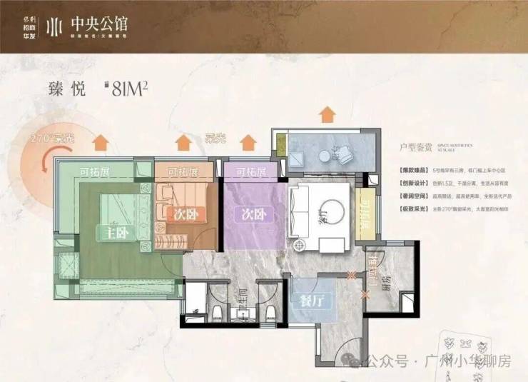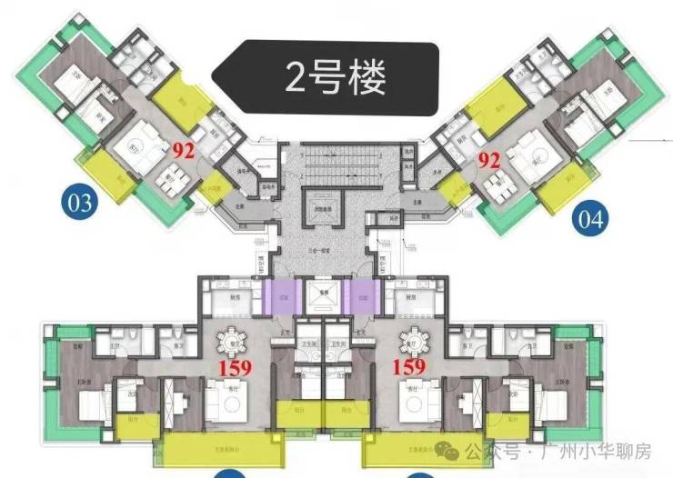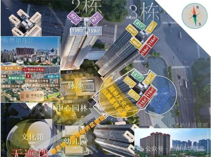 保利招商华发中央公馆采用了围合式设计,6栋47层高塔楼设计,小区自身配建有文化体育场馆和幼儿园,除了2#楼王是两梯四户,其余均为三梯六户,8#是5层高的文化馆,9#是配建3层高的幼儿园。