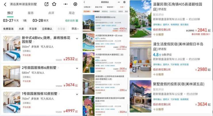而据我们对美团、携程、蚂蚁短租、飞猪等软件调查显示,别墅民宿也就平均 2200元/日,相对于住酒店,别墅民宿显得更有面子更有空间更有价值。