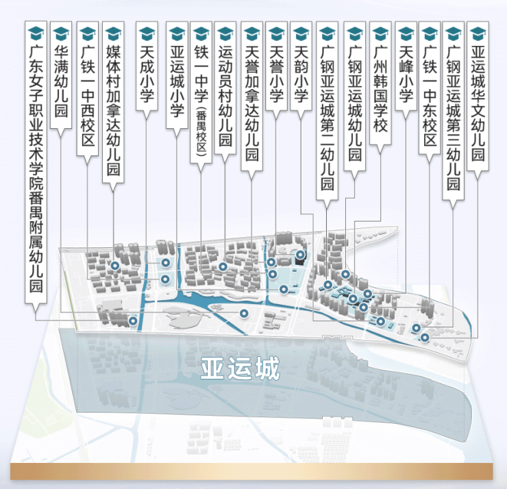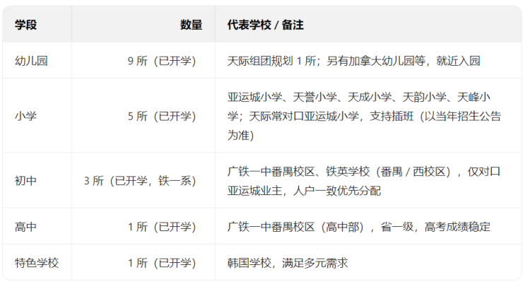 亚运城天际组团所在板块已形成幼儿园 — 小学 — 初中 — 高中的全龄教育闭环,以广铁一中(省一级)为核心,19 所学校均已开学,人户一致优先、生源稳定,接送半径友好。