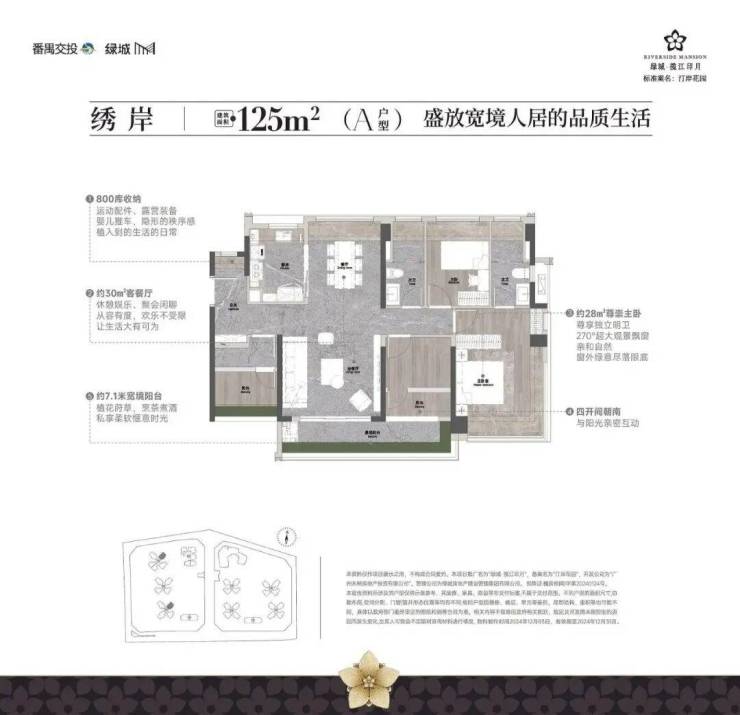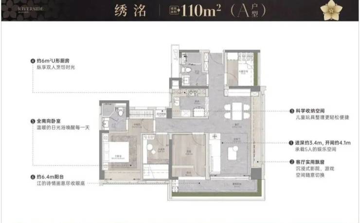 110㎡四房两厅两卫:紧凑四房布局,适合三口之家,南向采光充足,部分户型享江景视野;