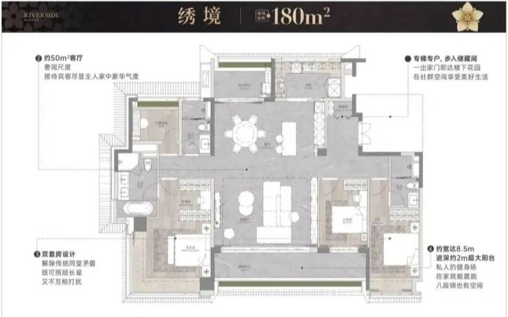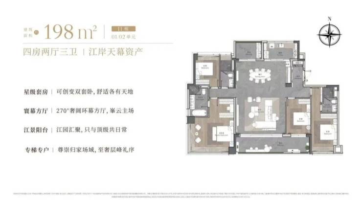 180-260㎡江景大平层:绿城高端产品线,180㎡四房三卫南向面宽优越,260㎡户型更是拥有25米瞰江尺度,入户双套房设计,居住奢享感拉满;