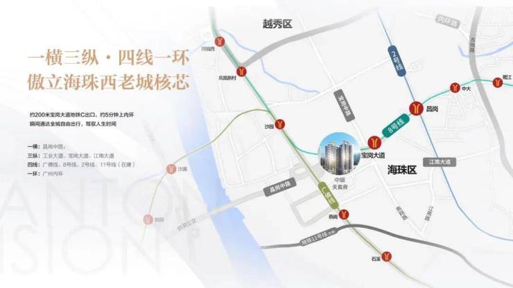 项目距离8号线宝岗大道地铁C出口仅150米,步行2分钟即达,约15分钟直达荔湾陈家祠(6站)、转2号线约15分钟直达海珠广场(4站),约20分钟到天河珠江新城(7站)。