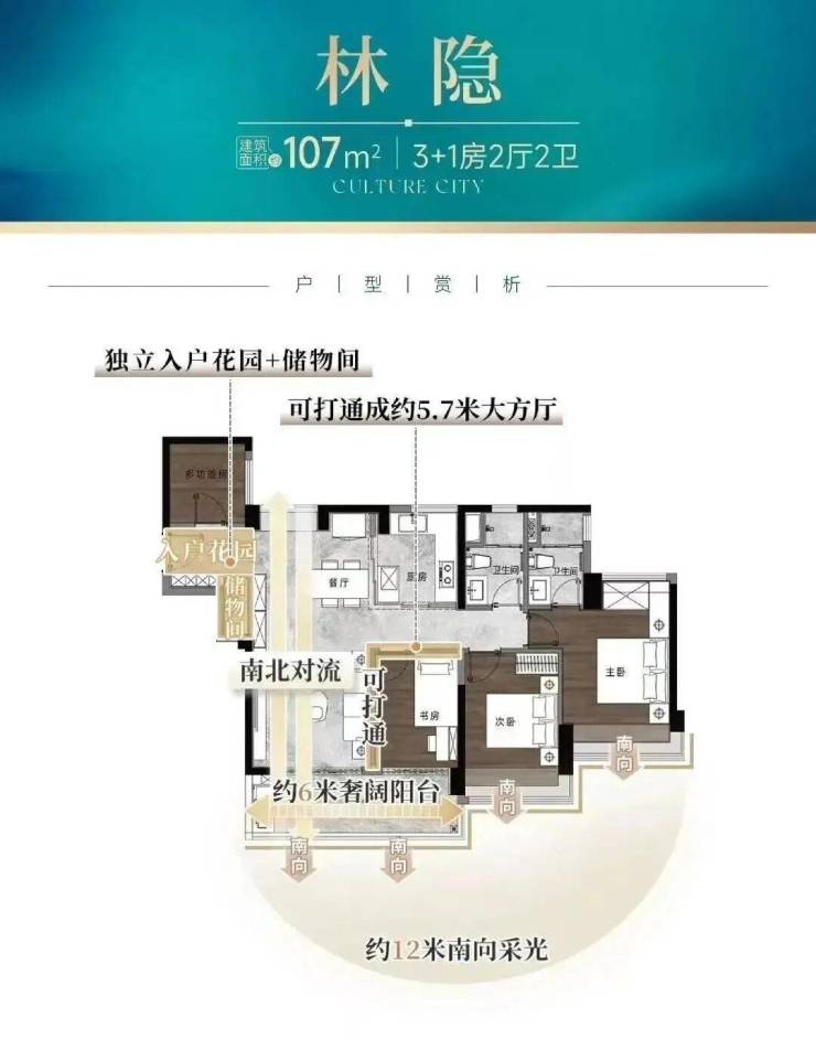 建面约107㎡的四房,拥有12米南向采光面,通透LDK一体化、约6米奢阔阳台,且带有独立入户花园。