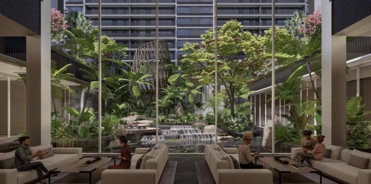 对标新加坡香格里拉 “花园翼”,打造谧境花园。大叶木棉、旅人蕉等热带植被丛生,台地花园、叠水水景、林下花园等多元景观,以五感为引,匠造 “海岛仙山,花园秘境”,让雨林意境融入生活。
