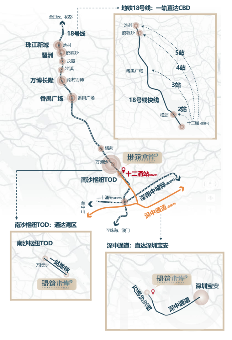 项目距离深中通道广州出入口约2公里,距离广州地铁18号线十二涌站约1.2公里,坐享广深中珠四地城际交通核芯。