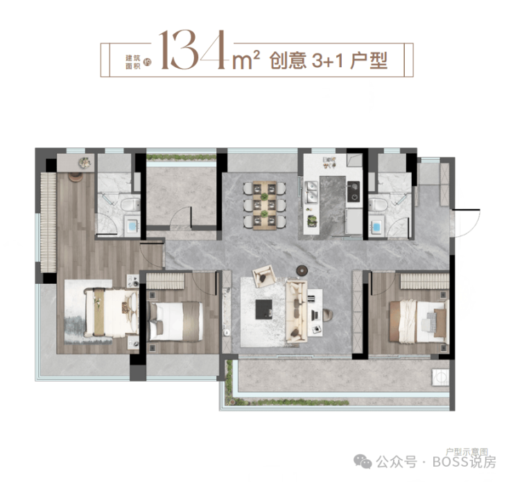 即常规 2 房 + 2 灵动空间之外,超宽客厅还能多辟出一个开放式 X 空间,设置开放式书房或休闲吧台都没问题,可根据具体需求进行调整。