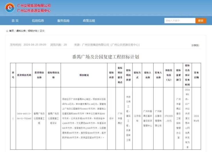 当前,番禺广场及公园复建工程招标计划已公布,预计总投资约1.6亿元,复建地上广场及公园面积约104637平方米,新建地上总建筑面积3850平方米。包括科技体验中心800平方米、文化展览800平方米、科普活动500平方米、游客服务中心500平方米等,将进一步崛起中轴发展新主场。(信息来源:广州交易集团有限公司官网)