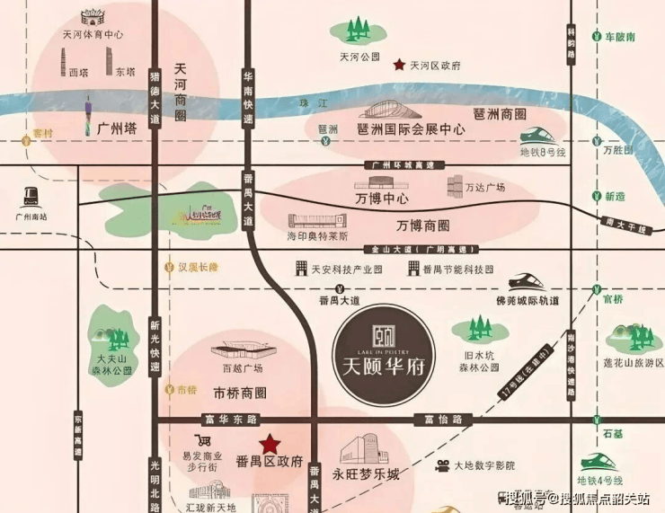 天颐华府的地理位置极具优势,地处番禺广场板块核心区域,紧邻番禺区政府,是番禺区的行政与商业核心地带。从交通配套来看,项目坐拥“四地铁交汇”的枢纽级交通优势,临近地铁3号线、18号线、22号线、17号线番禺广场地铁站,其中部分线路站点距离项目仅500米左右,步行即可轻松抵达。