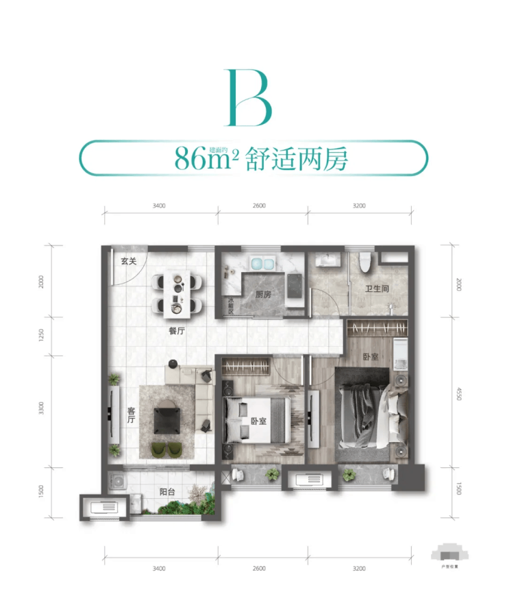B户型:约86㎡ | 2房1卫 | 均价12800元/㎡