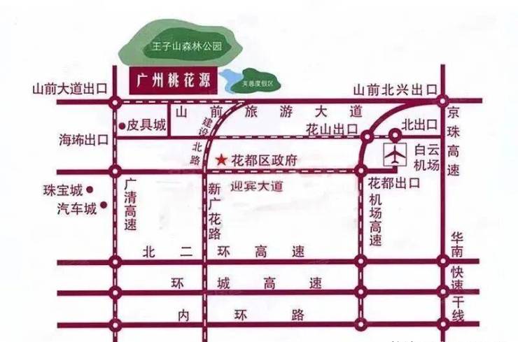 桃花源小区南距山前旅游大道约400米,西接广清高速山前大道出口;离花都中心城区约10公里,距广州新白云机场约15公里,距广州中心城区约30公里。