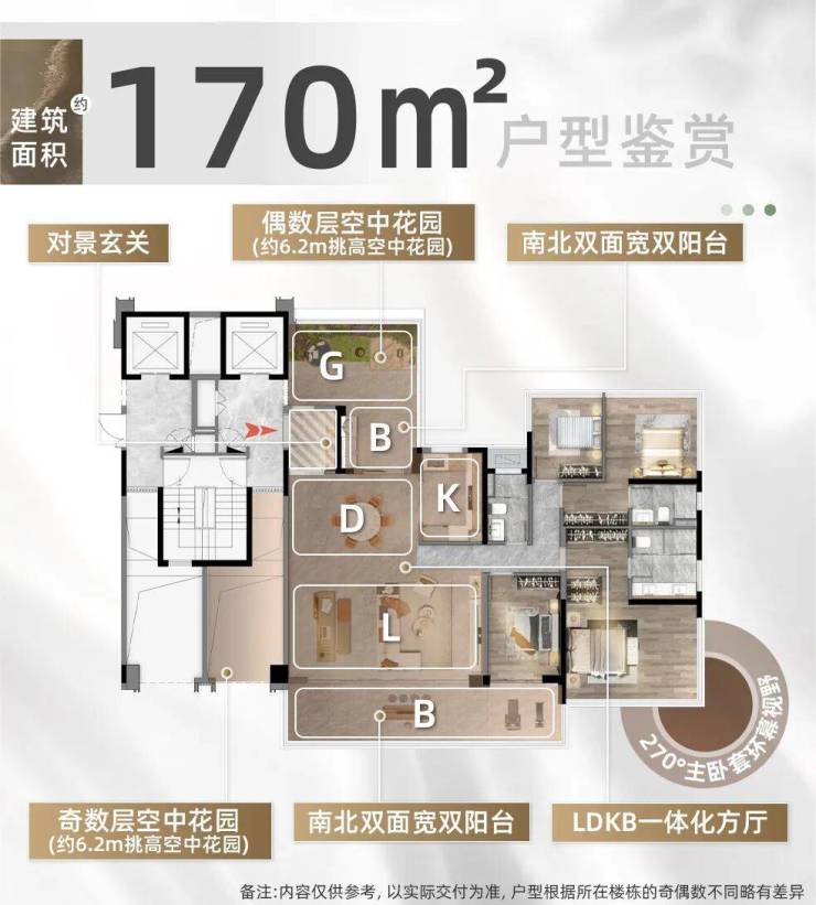 大平层“云璟组团”,涵盖127-170㎡四房,核心亮点是“6米挑高空中花园+超高得房率”,且奇偶层户型略有差异。