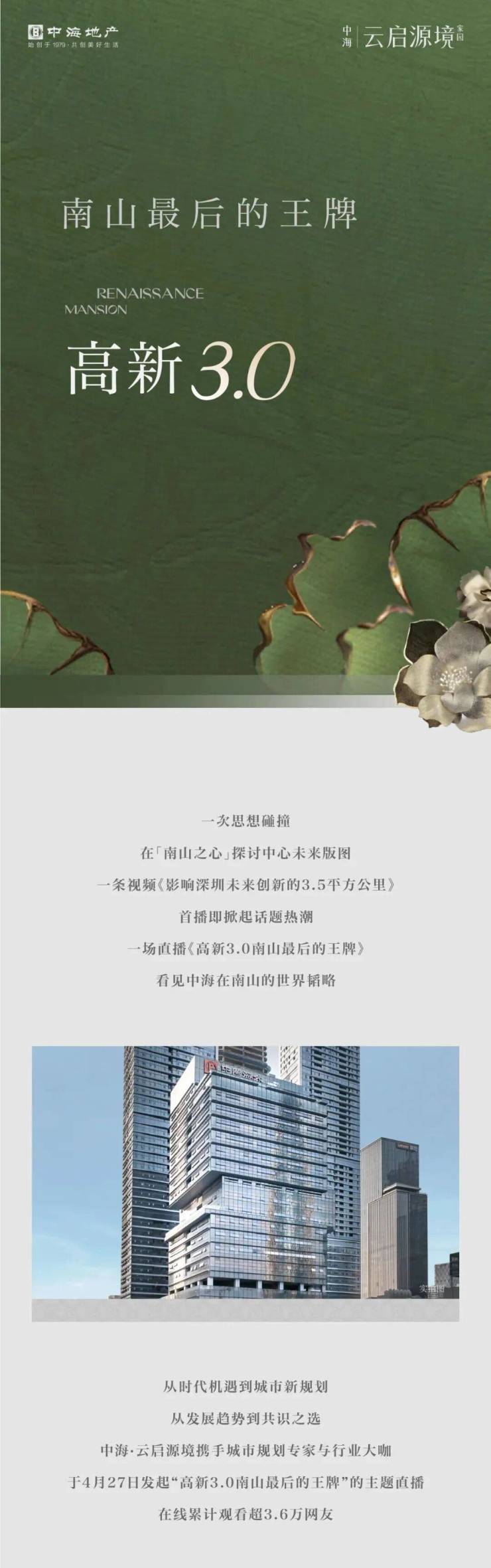 🔗科技园高知圈层聚集地——都心效率:项目立于科技园之上,与豪方天际花园、前海东岸构成纯粹高知的百万方社区氛围,焕新都心醇熟界面;以项目为圆心构建约三公里通勤圈,回应科技园精英家庭职住平衡的生活需求。(以中海云启源境为起点,以爱普生大厦为终点,百度地图测算步行距离约在三公里以内)