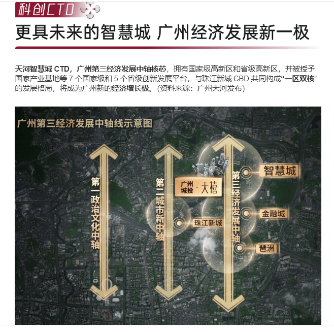 项目位于天河智慧城核心区域,广州第三经济发展中轴核心,拥有国家级高新区和省级高新区,并被授予国家产业基地等7个国家级和5个省级创新发展平台,与珠江新城CBD共同构成“一区双核”的发展格局,将成为广州新的经济增长极。