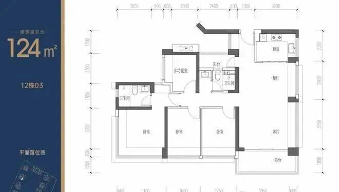 124㎡的4房2厅2卫,此户型为东南朝向,设计的是经典竖厅格局,客餐厅位都设计了飘窗,就是为了争取更多的赠送,动静分区,四开间朝南,主卧270°观景飘窗,L型厨房,公卫三段式分离,得房率约88%(包含赠送)。