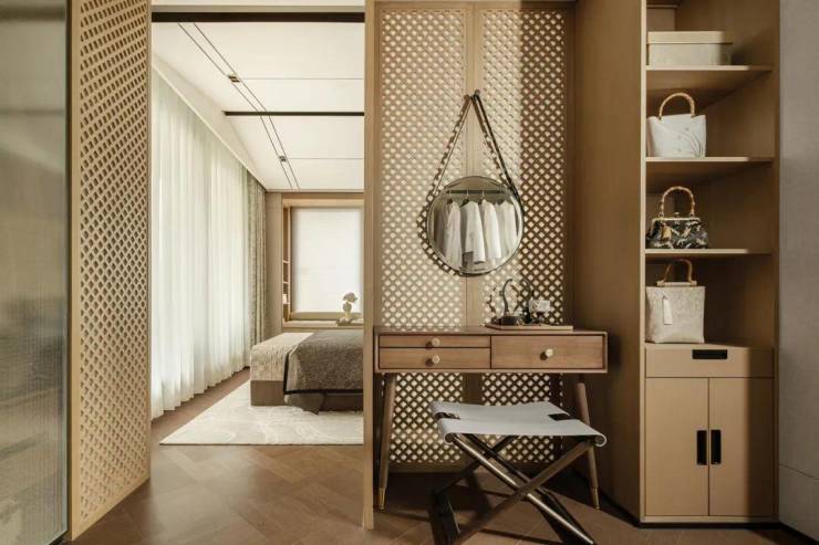 横平竖直的空间线条里,写意纹理如水墨般晕染开来,麻布、不锈钢、玻璃、实木等材质亦悄然置入,东方情韵与现代骨骼大胆融合,相得益彰。