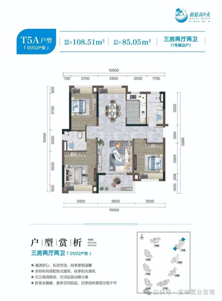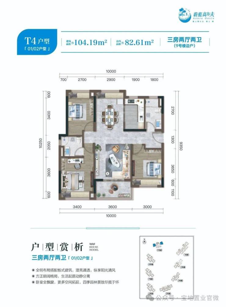 A 户型(1#、9# 楼边户,建面约 104-110㎡三房两厅两卫)